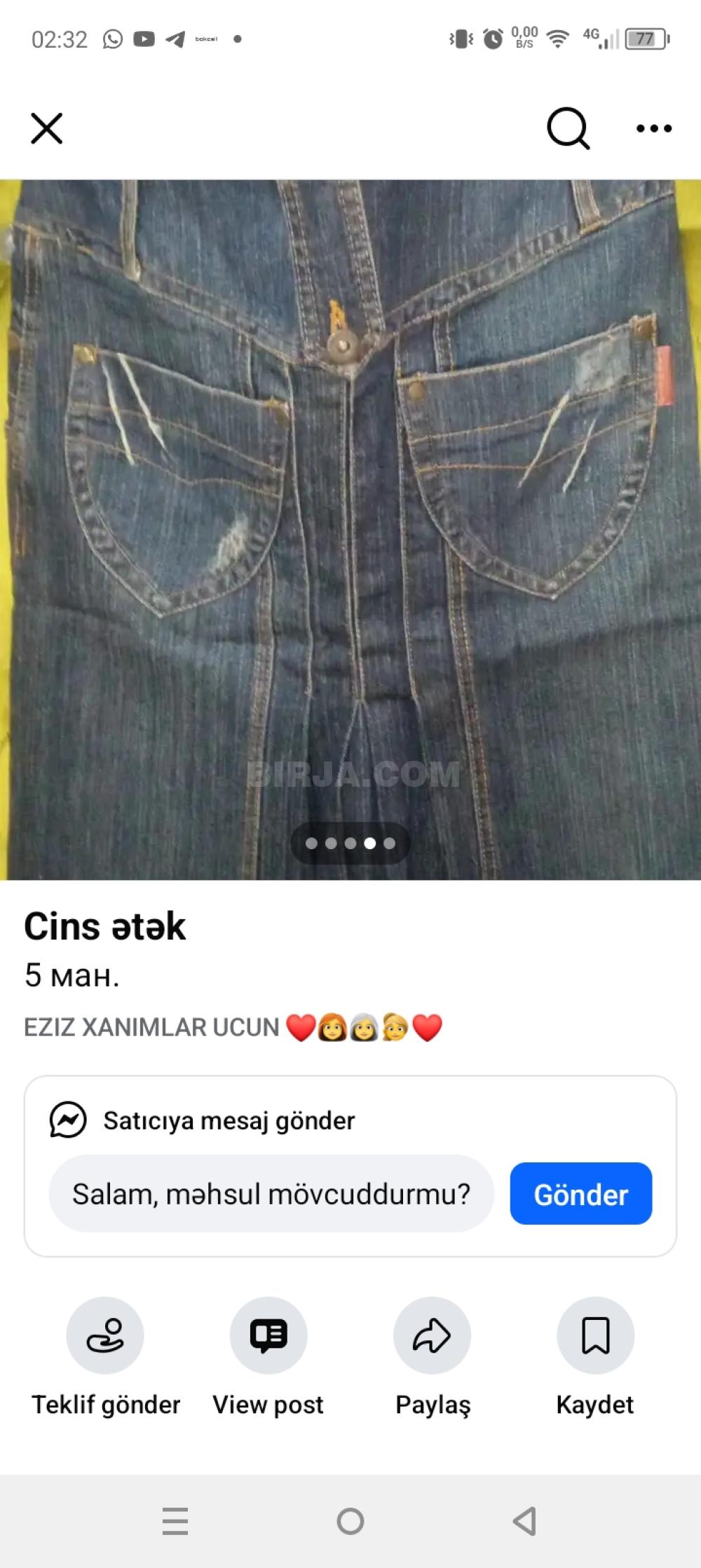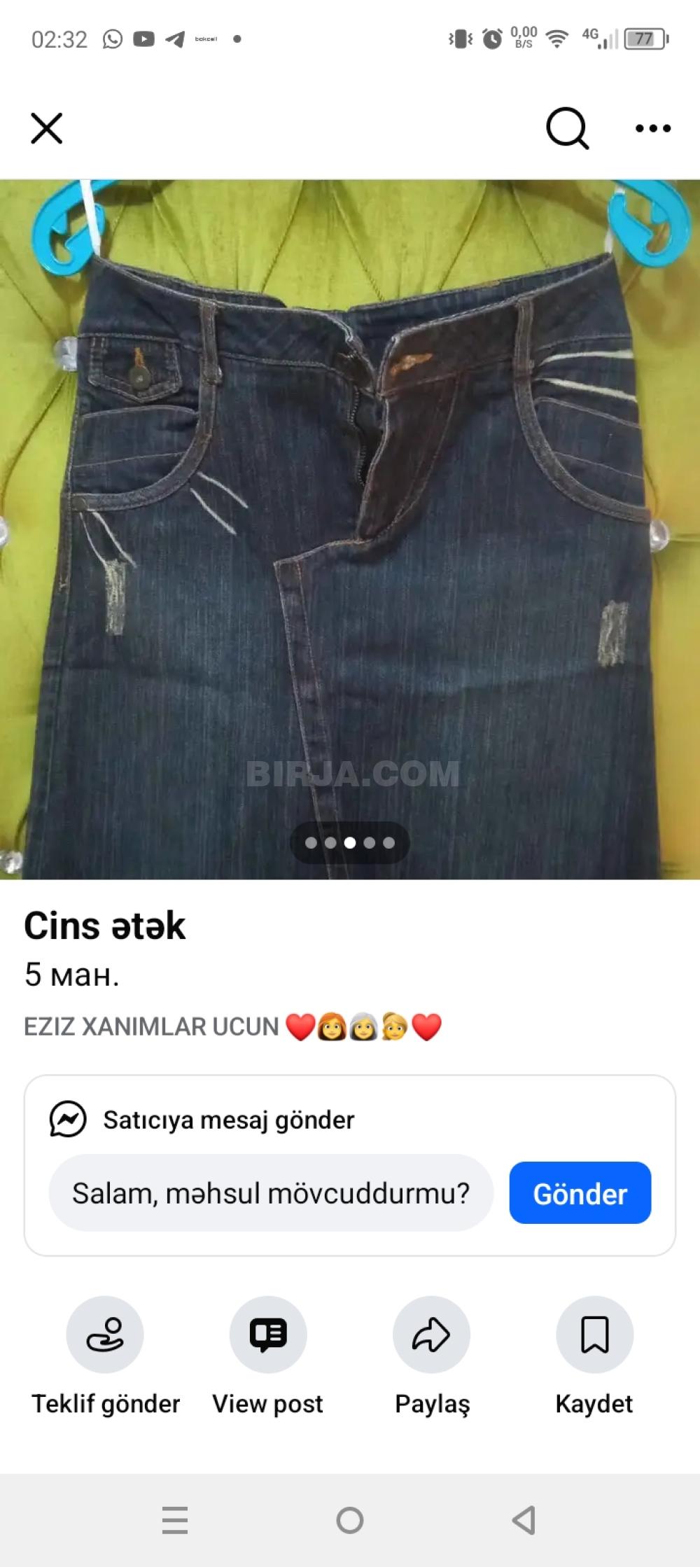 Jins etek və jaket maviden alınıb. qiymet razılaşmaq olar