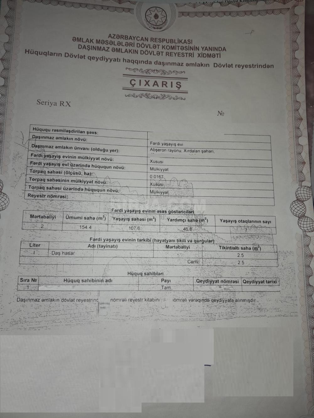 Xırdalan şəhəri AAAF aşağı daş bazarı və 120 nömrəli avtobusun son dayanacağına yaxın. Yola yaxındır. 2.7 sotda tikili 10x10 ölçüsündə 2 mərtəbəli həyət evi 1-ci mərtəbə - orta təmir 1 zal, 2 yataq otağı, mətbəx, hamam və tualet hamam metlaxın dəyişilməlidir.istilik kombidir. Eyni proekt 2-ci mərtəbədədir.2-ci mərtəbə təmirsizdir. Girişi çöl hissədəndir. Pilləkən hazır deyil. 1-ci mərtəbə ilə 2-ci mərtəbənin girişləri ayrıdır. Sadəcə olaraq 2-ci mərtəbəyə pilləkən tikilməlidir.ev 2013-cü ildə tikilib bünövrə beton, divar isə qoşa daşdır, mərtəbə arası monolitdir.torpağın və evin çıxarışı var.ipotekaya uyğundur. 2.7 sotda 7 otaqlı 200 kv 165.000 azn